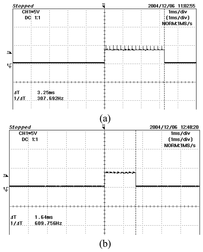 The rising edge of TGOUT signal is generated from the DAS when user sends a signal to the DAS to start conversion. It remains at 5 volt until one frame of conversion process finishes. Thus, if we probe the TGOUT signal, we can measure the total conversion time for one frame of data. For a system which runs at 5 kHz in this research, the TGOUT signals probed for both the 2-projection and 4-projection modes are shown in Figure 26.