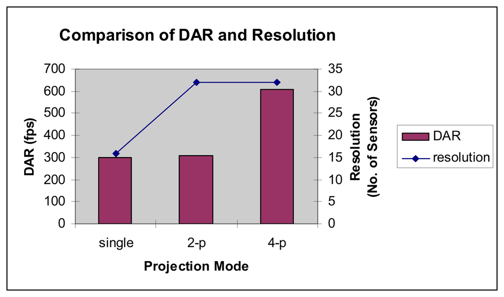 Thus, by comparing the number of sensors and DAR obtained by Chan [7] with the results achieved in this research, it has been verified that the multiple projection technique has a capability to increase the resolution of the hardware system (a higher number of sensors installed) and at the same time increasing the DAR (shorter time needed for data conversion in one frame). The graph shown in Figure 27 represents the improvement for the DAR achieved by multiple projection technique in this research when compared to the single projection result achieved by Chan [10].