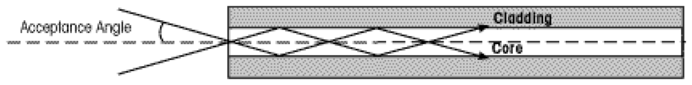 The fibre optic has a numerical aperture of 0.47 and acceptance angle of 28 degrees as stated in the data sheet. The numerical aperture determines the acceptance cone of the fibre [12]. Equation1 gives us the formula to calculate the numerical aperture and Figure 4 shows the acceptance angle of an optical fibre. The total receiving angle for the fibre optic is two times the acceptance angle and in this case, it is 56 degrees.