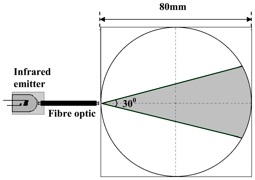 Unlike in the application of optical fibre sensors in parallel beam projection, the emission beam should not concentrate in a straight line. Instead, the emitted fan beam should have a transmission angle. Preliminary testing shows that the maximum achievable emission angle for the fibre optic transmitter is about 30°, after the fibre optic is being lensed. There are 32 fibre optic transmitters that are being used in this research; thus in order to make sure that the emission angle is approximately the same, each of the fibre optic emission angles is being tested experimentally as illustrated in Figure 5.