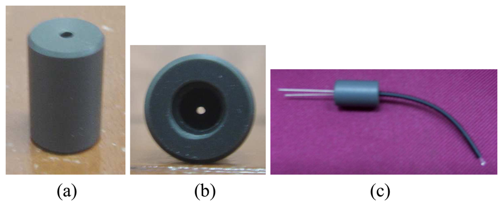 PVC housing (a) 3-dimensional view (b) Bottom view (c) Coupling with infrared emitter and fibre opti.