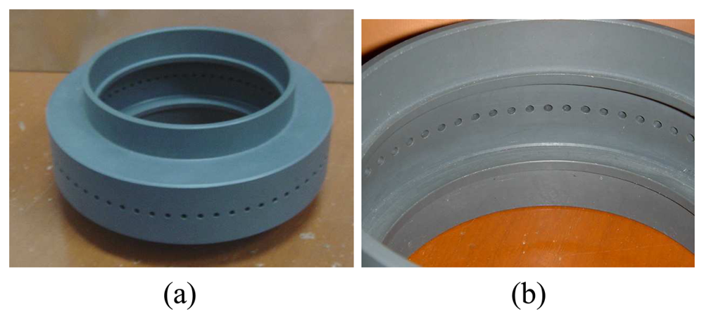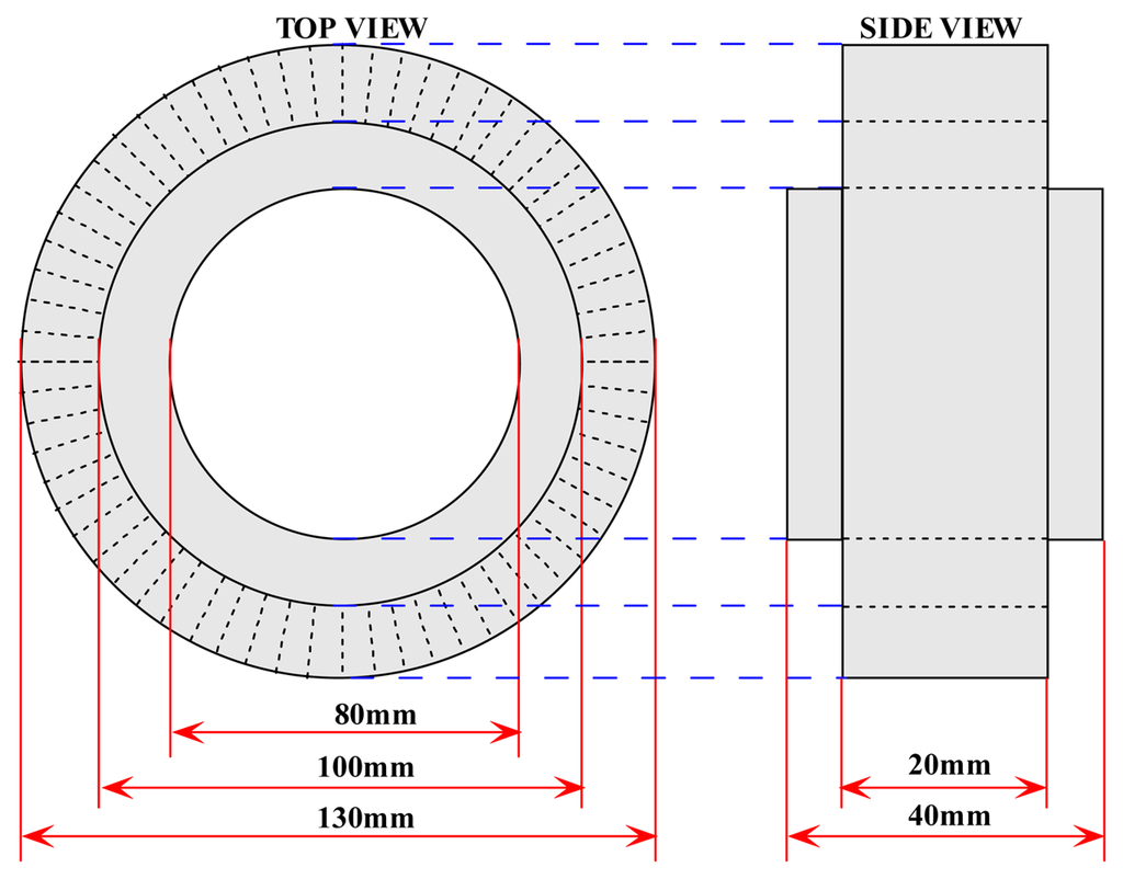 A custom-made sensor fixture is being designed to hold and support the optical fibres. The sensor fixture is also made of PVC and 64 holes (each with a diameter of 2.3mm) are being drilled along the periphery of the fixture. For a pipe with 80mm inner diameter, the diameter of the fixture peripheral that supports the fibre optics is 100mm as shown in Figure 8. Figure 9 further shows the actual photography of the optical fibre sensor fixture.