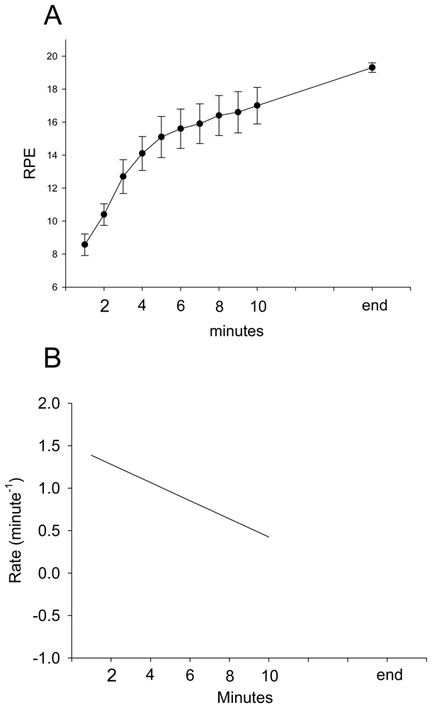 The group average and standard error of RPE during stepping exercise (A). The rate of RPE changes during stepping exercise (B).