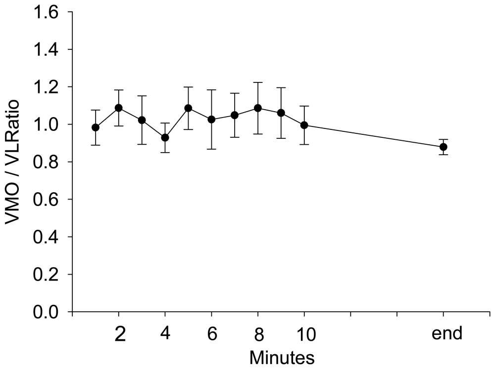 The group average and standard error of VMO / VL ratio during stepping exercise.