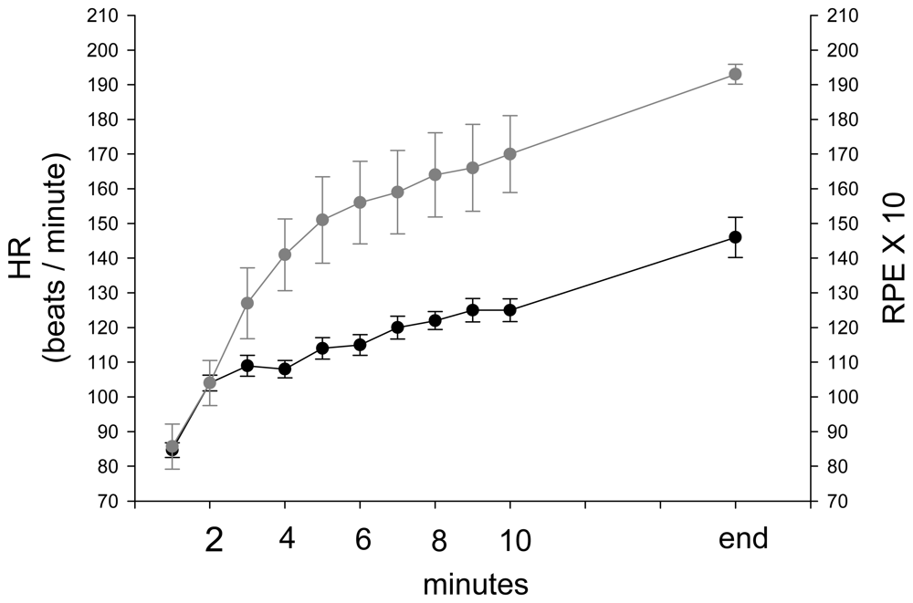 The group average and standard error of HR (black line) and RPEX10 (gray line) during stepping exercise.