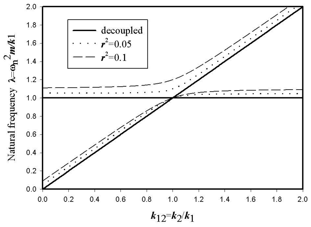 Eigenvalues for the decoupled case (r2 = 0) are λ1 = 1 and λ2 = k12. With the coupling effect, the eigenvalues, λ1 = 1 and λ2 = 1 + 2r2, are obtained from Eq. (2) by assuming k12 = 1.