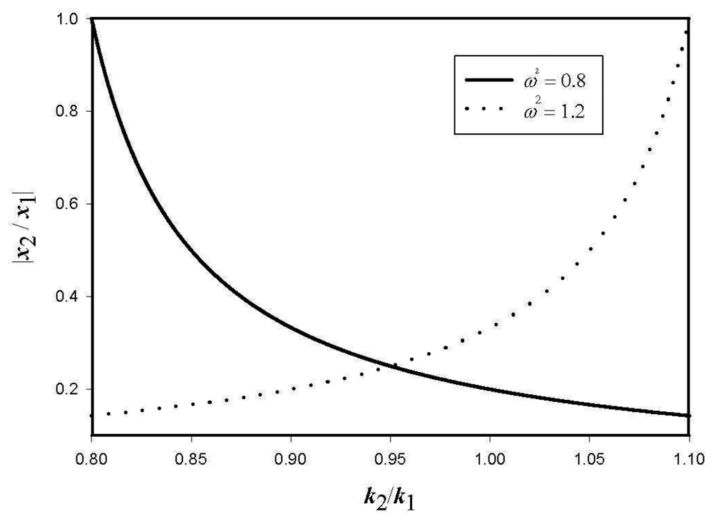 Figure 5 shows the amplitude ratio of the reference and the sensing vibrations as a function of k12 = k1/k2 for two cases. When the excitation frequency is less than the first natural frequency (ω2 = 0.8), the sensing vibration by the coupling effect becomes smaller for larger k12. However, as the system is excited above the second natural frequency (ω2 = 1.2>1 + 2r2), the coupling effect increases for increasing k12. Note that the degree of the coupling effect can be adjusted by changing the ratio of k1 and k2but the sensitivity of the system is reduced at k1 ≠ k2. Therefore, both effects of the structural coupling and sensitivity should be considered simultaneously in designing the gyroscope.