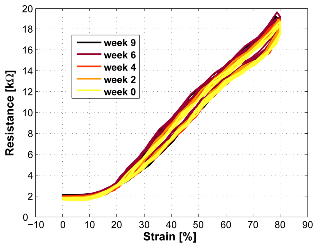 To confirm that a pre-stretched sensor remains stable, the increasing strain test in Fig. 7 was repeated with a pre-stretched sensor (the time between pre-stretching and the test was 24 hours). The result was the same behavior as shown in Fig. 6 which confirms that a pre-stretching is necessary and that it ensures stable sensor properties.