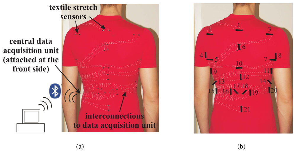 Architecture overview of a prototype recognizing upper body postures using strain sensors (Fig. 12(a)). In Fig. 12(b) the exact positioning of the sensors is shown.