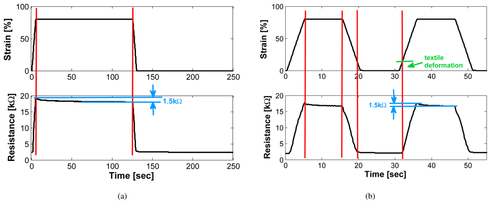 It is apparent that this sensor has a remarkably small creep compared to other textile sensors. When the strain is kept constant, it relaxes by 1.5kΩ (see Fig. 4(a)) while the total range is 17kΩ. This results in an inaccuracy of 8.8% caused by the relaxation.