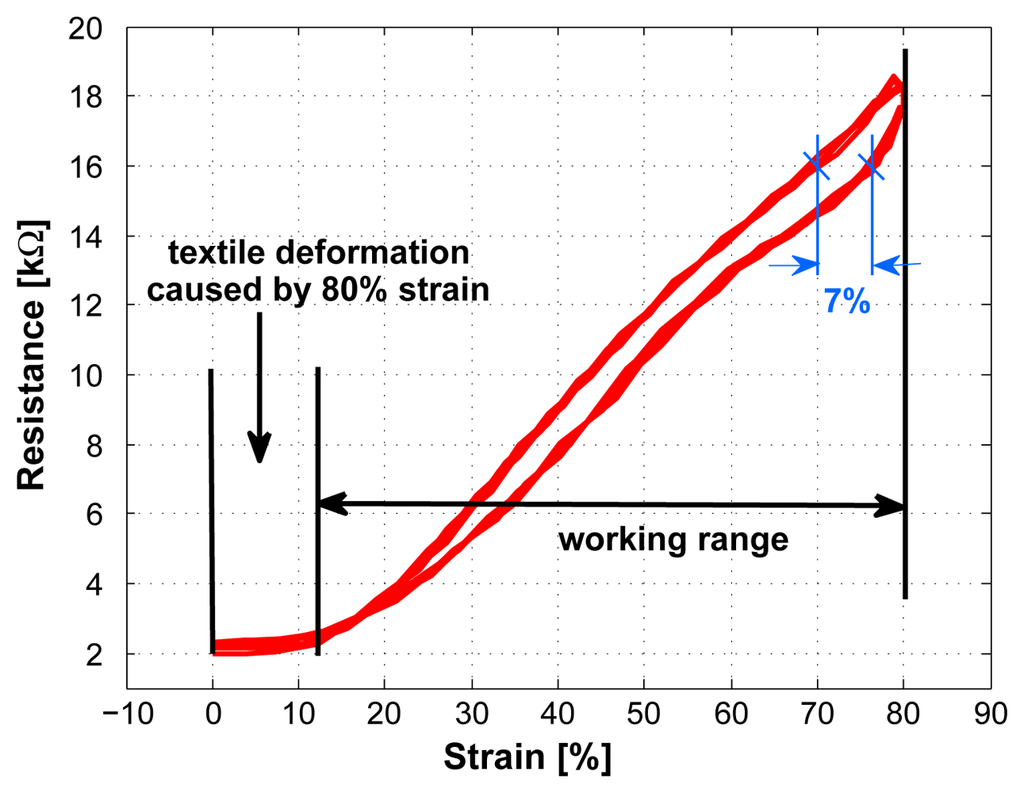 - When stretching the sensor material described in Section 2.1 alone, it experiences a permanent plastic deformation: The sensor gets longer and does never return to its original length. Therefore, the sensor material alone has a reduced elongation range of the applied stretch minus the permanent deformation. However, when the sensor is attached to the textile using silicone, the sensor is forced back to its original length and, therefore, has a larger working range.