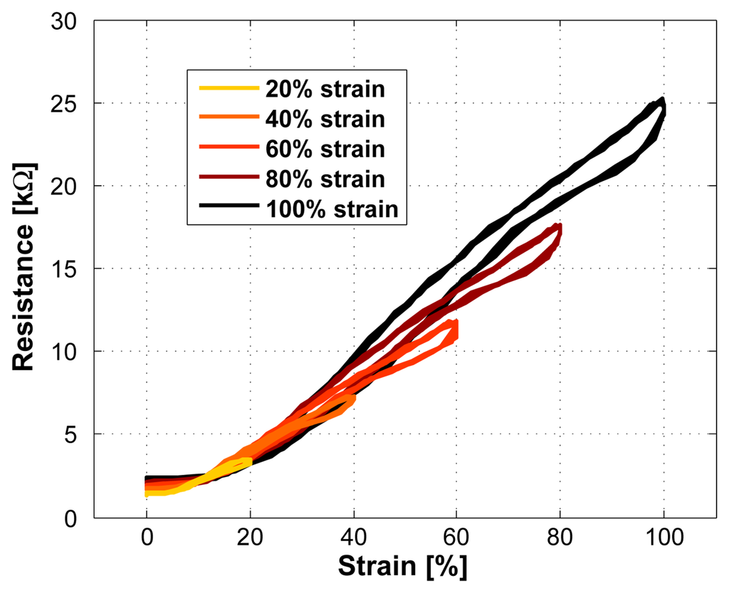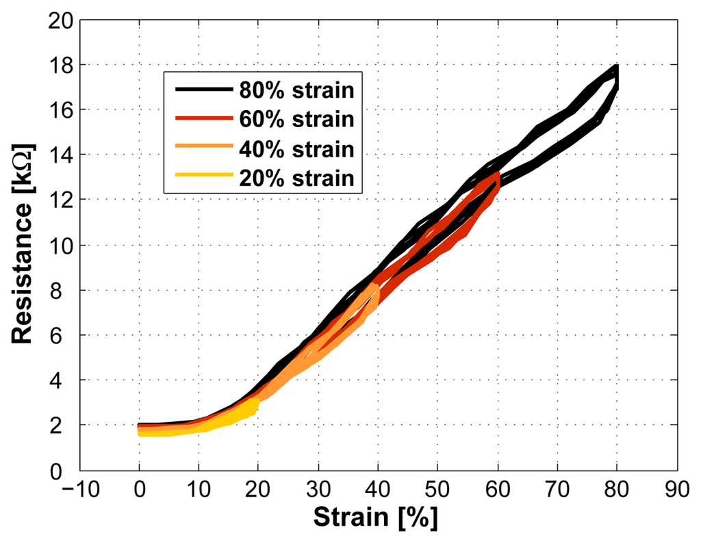 A typical resistance vs. strain plot is shown in Fig. 5, indicating a linear rise in resistance when applying strain and only a small hysteresis. A system with hysteresis is defined as a system whose output does not only depend on the current input but also on the history of the input. Typical causes for hysteresis are friction and structural changes in the material [15].