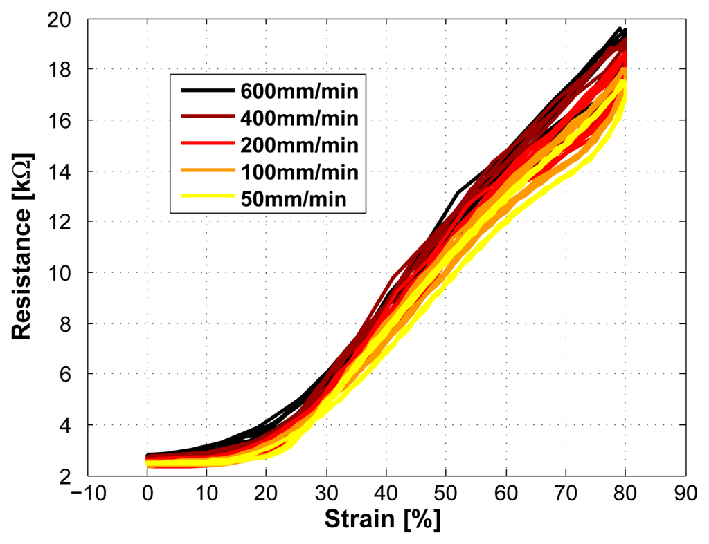 - varying speed The strain rate was varied between 50mm/min and 600mm/min (50, 100, 200, 400, and 600mm/min), covering a typical motion speed range of the human body. This measurement gives information about an influence of the strain rate on the sensor characteristics.