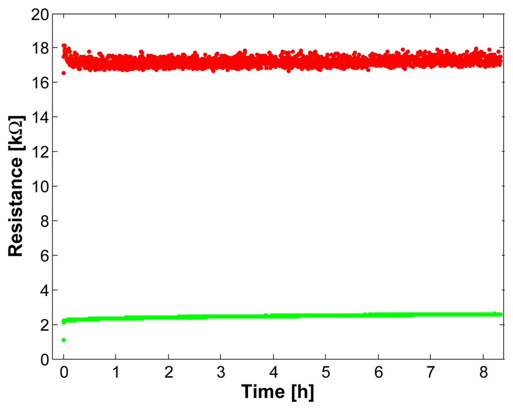 The sensor was cycled for 16 hours whereas the maximum and minimum resistance values of the first 8 hours are shown.