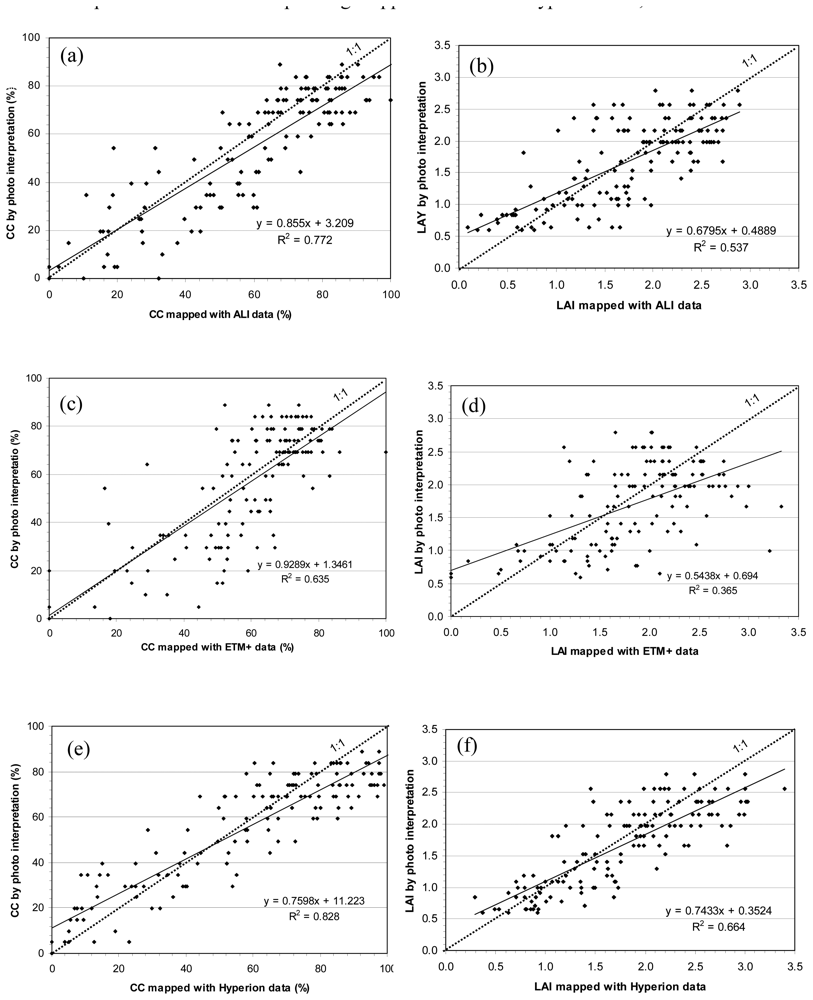 - Step 6. Calculate root mean squared error (RMSE) and map accuracy for the 144 mapped values. Plot scatterplots of interpreted CC and LAI values against mapped CC and LAI values based on the results derived at steps 3 – 5.