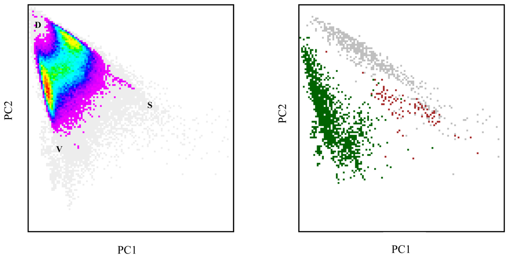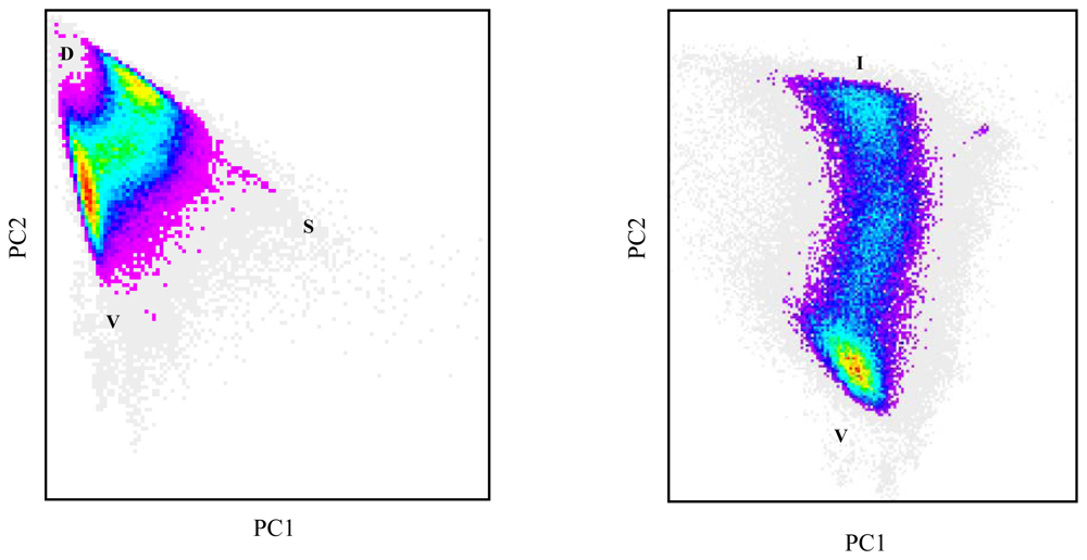 Landsat ETM+ feature space made up by the first and second principal components before (left) and after brightness normalisation (right). Colours indicate pixel frequencies ranging from very low densities (grey and magenta) to high densities (red and yellow).