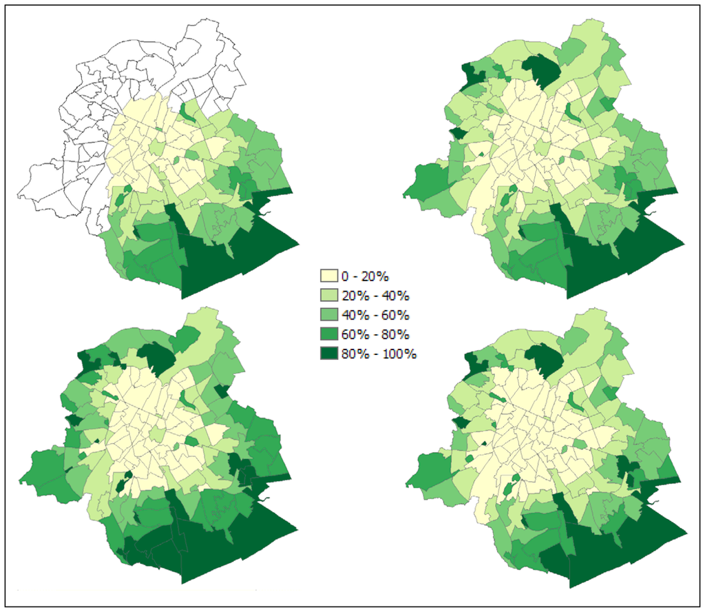 Estimations of vegetation fraction for neighbourhoods in Brussels based on a high resolution image classification with post-classification processing (top left – covers only part of the city's area), linear regression (top right) of a Landsat ETM+ image, SVD linear spectral mixture analysis (bottom left) and multi-layer perceptron unmixing (bottom right).