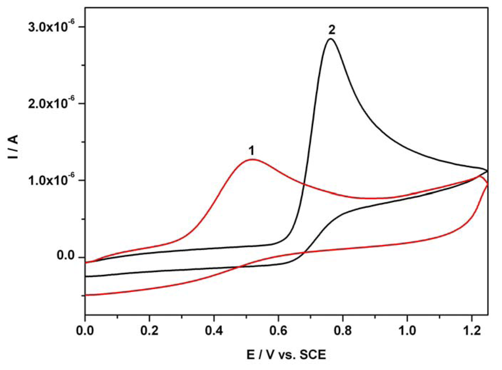 Cyclic voltammograms (CVs); 1 - 0.06 mM AA; 2 - 0.12 mM AC; supporting electrolyte: Britton-Robinson buffer pH 1.96; starting potential 0V vs. SCE; potential range: 0 V → + 1.25 V → 0 V vs. SCE; scan rate: 0.05 Vs-1.