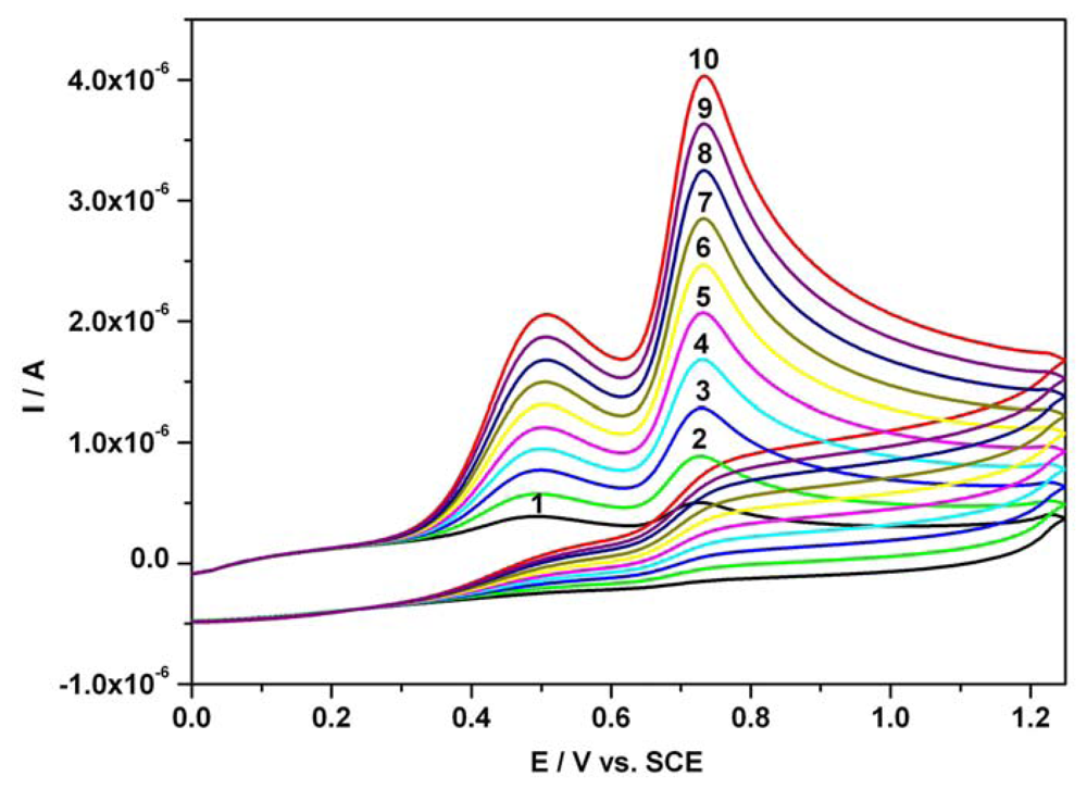 Resultant cyclic voltammograms (CVs) of AA and AC mixture; 1 – 0.01 mM AA and 0.01 mM AC; 2 – 0.02 mM AA and 0.02 mM AC; 3 – 0.03 mM AA and 0.03 mM AC; 4 – 0.04 mM AA and 0.04 mM AC; 5 – 0.05 mM AA and 0.05 mM AC; 6 – 0.06 mM AA and 0.06 mM AC; 7 – 0.07 mM AA and 0.07 mM AC; 8 – 0.08 mM AA and 0.08 mM AC; 9 – 0.09 mM AA and 0.09 mM AC; 10 – 0.1 mM AA and 0.1 mM AC; supporting electrolyte: Britton-Robinson buffer pH 1.96; starting potential 0V vs. SCE; potential range: 0 V → + 1.25 V → 0 V vs. SCE; scan rate: 0.05 Vs-1.