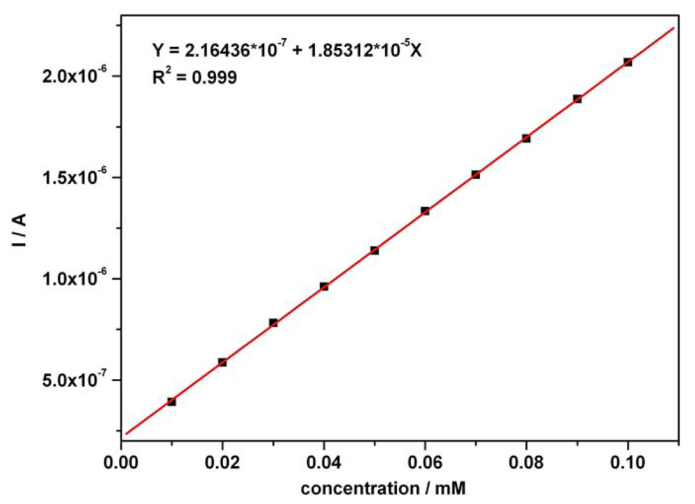 The calibration plots (Figures 3 and 4) of anodic current peaks versus concentration of AA as well as AC in the mixture system, were linear exhibiting very good correlation coefficients and high sensitivities of 18.53 μA mM-1 for AA (curve in Figure 3) and 24.05 μA mM-1 for AC (curve 2 in Figure 4); curve 2 has been derived from curve 1 by an approximated current correction through AA remnant current in the potential range corresponding to AC detection. The obtained sensitivity from curve 2 was below 39.19 μA mM-1, the apparent sensitivity without any correction (curve 1 in Figure 4). A corrected sensitivity for AC has been evaluated by approximated extrapolation of remnant current derived from the minimum values read on the forward branches of the CVs from Figure 2 around 0.625-0.65 V vs. SCE. The essential aspects regarding direct linearity of the resultant amperometric signals versus concentration were determined and certified to be in accordance with our previous conclusions [53]. The obtained CV data and the very good linearity of the plots of current peaks versus concentration for the used compounds suggested a very useful foundation for the next step as practical applications of the chronoamperometric sensing and evaluation of the target compounds concentrations at established optimum fixed potential.