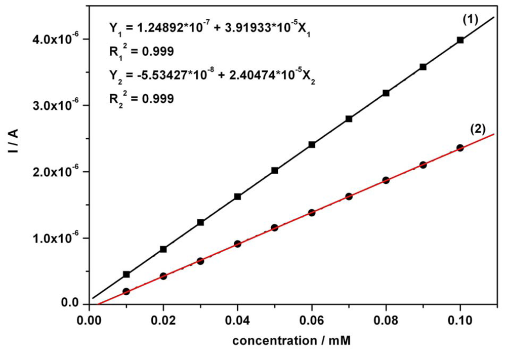 Calibration plots of I vs. AC concentration in mixture solution around + 0.75 V vs. SCE (under the conditions mentioned in Figure 2); (1) – without background current correction; (2) – approximated with a subtraction of extrapolated AA current read around + 0.625 V vs. SCE, as a correction for AC current peak values.