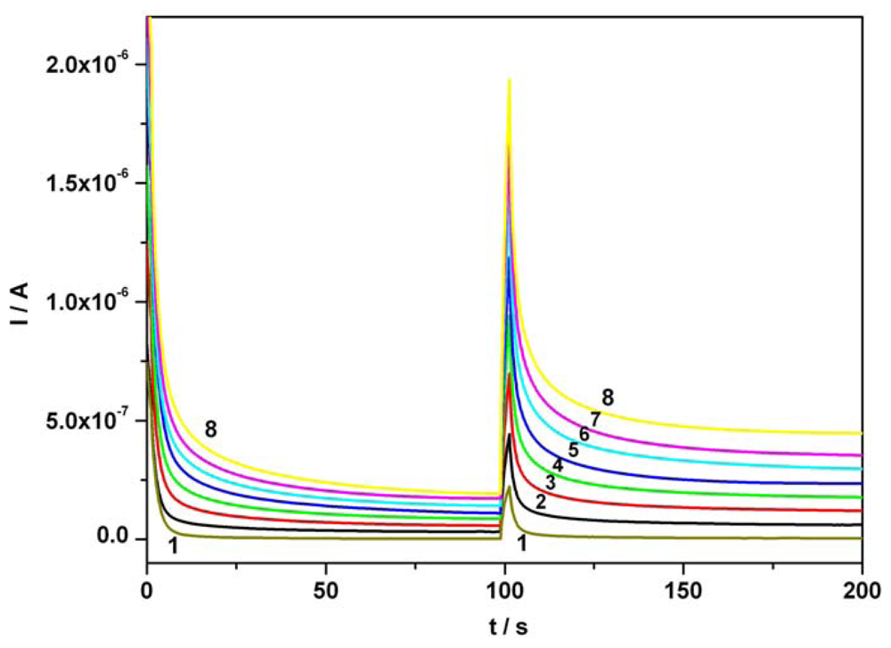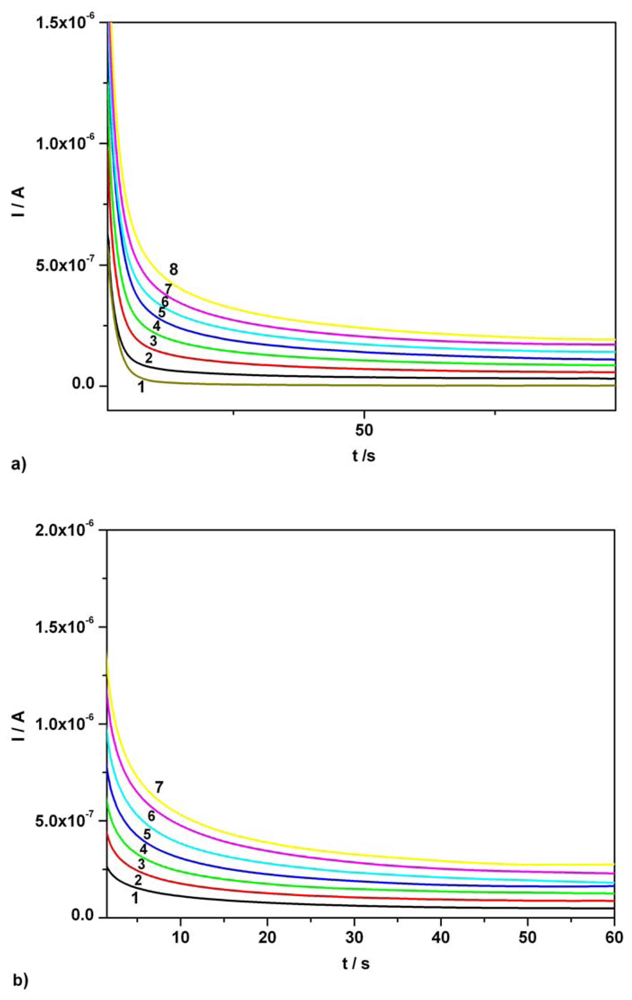 Chronoamperograms (CAs). (a) Effect of AA concentration at one potential level, + 0.5 V vs. SCE, around the corresponding current peak potential from CVs; 1 – supporting electrolyte; 2 – 0.01 mM AA; 3 – 0.02 mM AA; 4 – 0.03 mM AA; 5 – 0.04 mM AA; 6 – 0.05 mM AA; 7 – 0.06 mM AA; 8 – 0.07 mM AA; supporting electrolyte: Britton-Robinson buffer pH 1.96; (b) Effect of AC concentration at one potential level, + 0.75 V vs. SCE, around the corresponding current peak potential from CVs; 1 – 0.01 mM AC; 2 – 0.02 mM AC; 3 – 0.03 mM AC; 4 – 0.04 mM AC; 5 – 0.05 mM AC; 6 – 0.06 mM AC; 7 – 0.07 mM AC; supporting electrolyte: Britton-Robinson buffer pH 1.96.