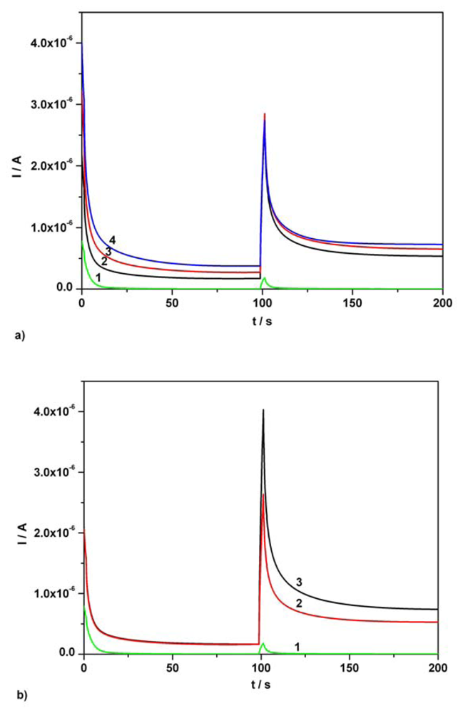 (a) Continuous chronoamperograms (CAs) at two potential levels, + 0.5 V, + 0.75 V vs. SCE. 1 – supporting electrolyte; 2 – 1/50 dilution of Efferalgan initial solution in supporting electrolyte; 3 - 1/50 dilution of Efferalgan initial solution in supporting electrolyte and AA addition, 0.03 mM AA final supplementary concentration; 4 - 1/50 dilution of Efferalgan initial solution in supporting electrolyte and AA addition, 0.06 mM AA final supplementary concentration; supporting electrolyte: Britton-Robinson buffer pH 1.96; current readings at 100s. (b) CAs at two potential levels, + 0.5 V, + 0.75 V vs. SCE. 1 - supporting electrolyte; 2 – 1/50 dilution of Efferalgan initial solution in supporting electrolyte; 3 - 1/50 dilution of Efferalgan initial solution in supporting electrolyte and AC addition, 0.06 mM AC final supplementary concentration; supporting electrolyte: Britton-Robinson buffer pH 1.96; current readings at 150s.