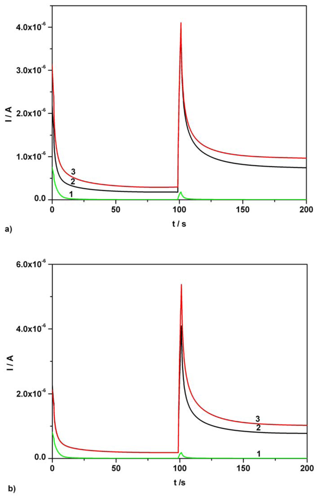 (a) Continuous chronoamperograms (CAs) at two potential levels, + 0.5 V, + 0.75 V vs. SCE. 1 – supporting electrolyte; 2 – 1/50 dilution of Fervex initial solution in supporting electrolyte; 3 - 1/50 dilution of Fervex initial solution in supporting electrolyte and AA addition, 0.03 mM AA final supplementary concentration; supporting electrolyte: Britton-Robinson buffer pH 1.96; current readings at 100s. (b) CAs at two potential levels, + 0.5 V, + 0.75 V vs. SCE. 1 – supporting electrolyte; 2 – 1/50 dilution of Fervex initial solution in supporting electrolyte; 3 - 1/50 dilution of Fervex initial solution in supporting electrolyte and AC addition, 0.06 mM AC final supplementary concentration; supporting electrolyte: Britton-Robinson buffer pH 1.96; current readings at 150s.