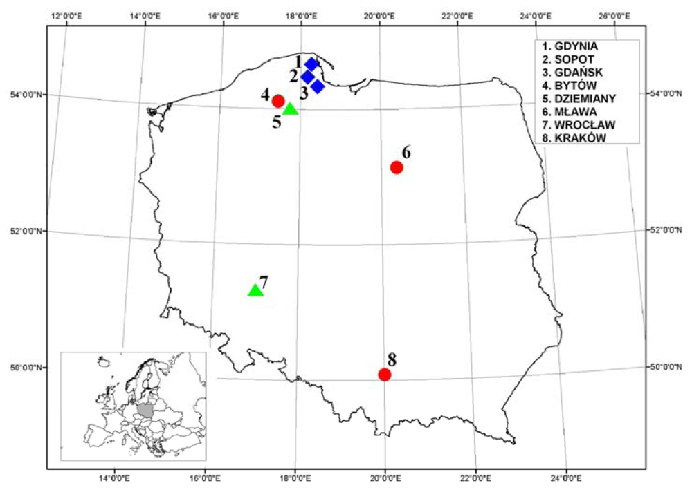 Dew samples were collected from eight measurement stations from August 2004 to November 2006. Taking into account the type of land use and chatacteristics of pollutant emissions, the sampling sites were divided into three groups: rural stations (located in agricultural areas: Wrocław, Dziemiany); coastal urban stations (close to the coast line: Gdańsk, Sopot, Gdynia) and inland urban stations (the chemical composition of precipitation in a town, with increasing traffic intensity and industry: Bytów, Mława, Kraków). Table 1 summarizes the basic characteristics of the sampling sites and Figure 1 illustrates their geographical locations. Dew samples were collected using a sampler based on the design described by Muselli et al. [16], placed 50 cm above ground. Basic information concerning the applied sampler is presented in Table 2.