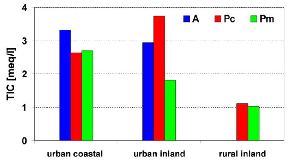 The inner diversity of dew pollution in the urban stations was closely related to its distance from the Baltic coast. It was a characteristic feature that average TIC results in A, Pc and Pm masses in urban coastal stations were comparable, reaching the values of 3.32, 2.63 and 2.69 meq/L, respectively. However, these TIC results in urban inland stations showed significant diversity, reaching the values of 2.94, 3.73 and 1.81 meq/L, respectively. This can be explained by local breeze circulation in the warm part of the year, mainly in the form of a diurnal breeze. Breeze circulation, generated by the thermal difference between land and sea with a prevailing low horizontal pressure gradient, occurred in each of the investigated air mass types. A diurnal breeze forces air flown in from the sea onto land, causing on increase in the concentration of Na+ and Cl- ions. The flowing air mass is then polluted by local emission sources.
