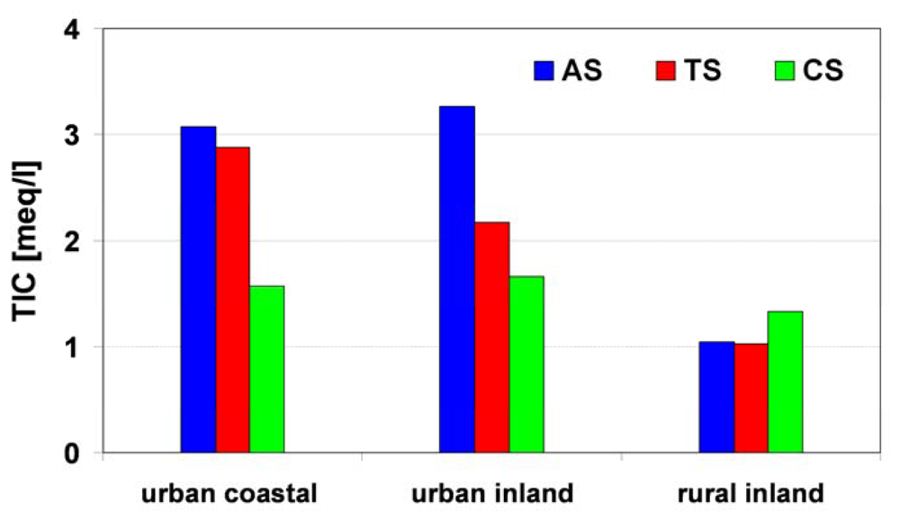 In rural stations, average TIC results were the lowest and characterized by the smallest diversity for AS, TS and CS situations, reaching values of 1.04, 1.02 and 1.33 meq/L, respectively (Figure 11). In relation to AS and TS situations, these values were two times lower when compared with stations representing urban areas. The smallest TIC diversity for three investigated landuse categories was characteristic for cyclonic situations. It confirmed the significantly smaller role of local pollutant emission sources under such conditions. The reason lies in the specificity of the cyclonic weather. Then, the mesoscale ascending flow occurred, which caused an intensive vertical air exchange and dispersion of pollutants. Consequently, the role of local emission sources decreased and pollutant concentrations in dew in all types of stations was comparable to the (macro) regional background. Additionally, the washout of pollutants from the atmosphere in cyclonic weather was more efficient than in the anticyclonic one, due to more frequent precipitation events.