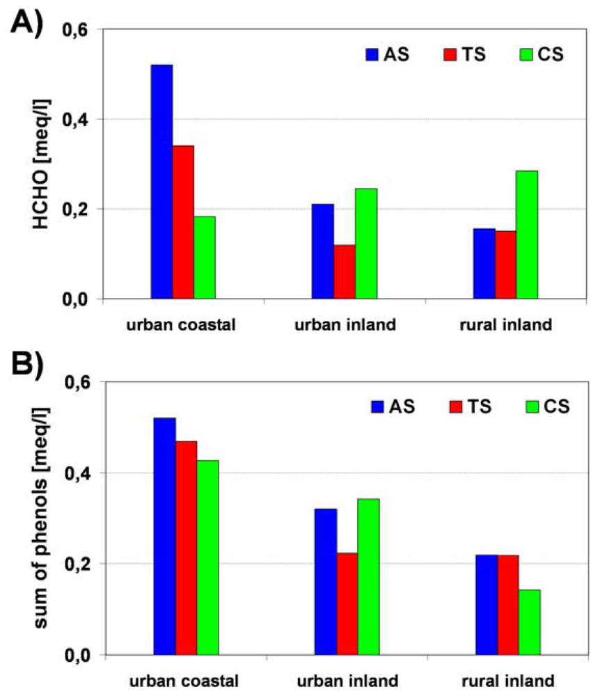 HCHO was found in 97 % of dew samples, with concentrations ranging from 0.010 to 5.40 meq/L. The highest average formaldehyde concentrations were observed for dew samples collected from the rural inland station (Wrocław). HCHO is emitted in to the atmosphere from exhaust gases from domestic heating, where it can be scavenged by wet and dry deposition. However, phenols were found in 95 % of dew samples, with concentrations ranging from 0.005 to 2.43 meq/L. The highest average sum of phenols concentrations was observed for dew samples collected from the urban coastal station. The high concentration levels of phenols in runoff waters collected in the area of the centre of Gdańsk and Gdynia are mainly caused by high traffic intensity and industrial factories situated in the surrounding area of these cities. The petroleum refinery alone introduces approximately 118 kg of phenols to the surface waters annually.