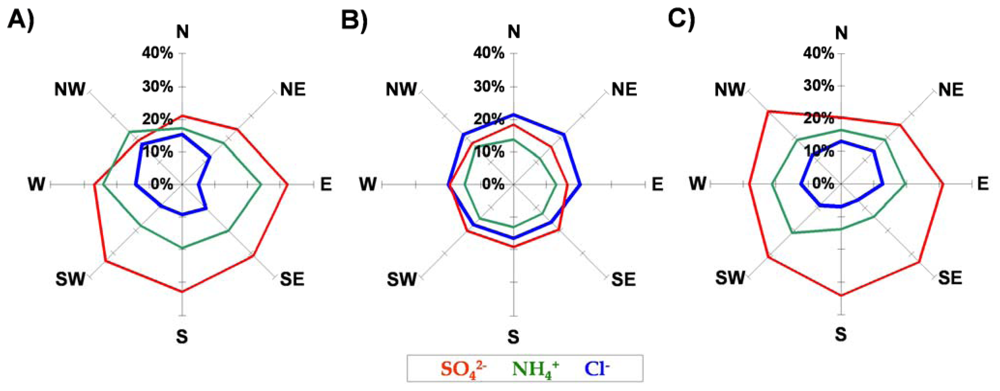 Relative contribution of SO42-, NH4+ and Cl- in dew samples versus direction of circulation for different types of landuse in Poland (A-rural station Dziemiany; B-urban coastal stations Tricity; C-urban inland station Bytów).