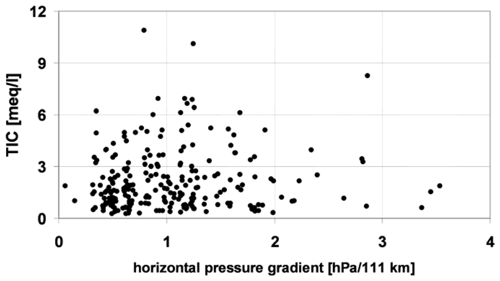 Concentration of TIC in dew samples versus horizontal pressure gradient.