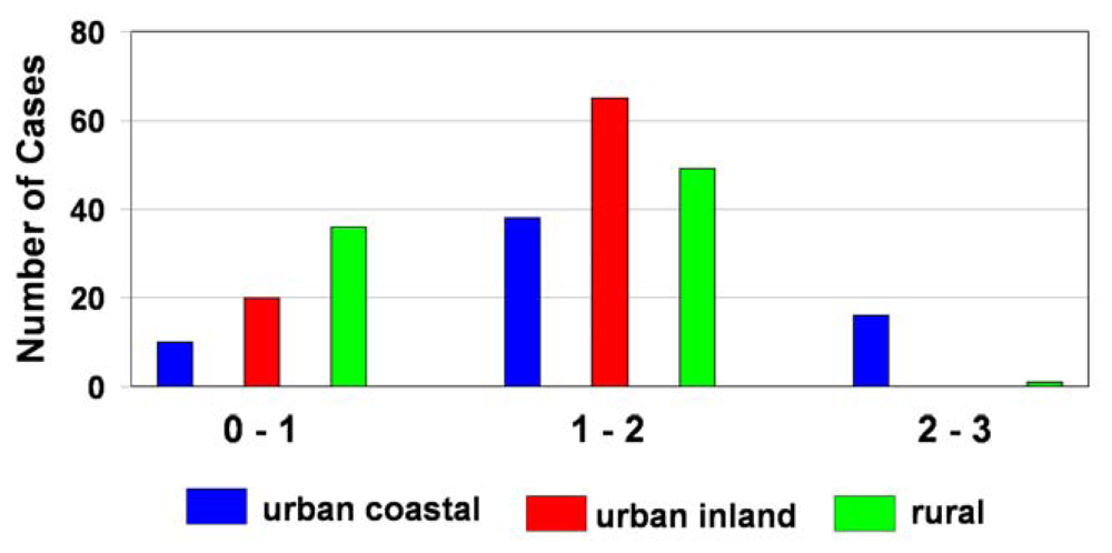 There was no clear relation among select ion concentrations and different directions of atmospheric circulation, which could possibly be attributed to the emission background of the selected sampling sites (Figure 13). Nevertheless, some effects were visible. A directional asymmetry of major ions was observed at urban coastal stations where Cl- had the highest concentration when air flew from the sea (northern half of horizon) while SO42- took this role during southern circulation, when air masses came from inland areas. On the other hand, all Cl- concentrations at urban coastal stations, independent of circulation direction, were around twice as large as those at urban inland stations. This fact supports the hypothesis about the significant role of a diurnal sea breeze, which penetrates deep inland, delivering sea-salt aerosol, even on days with synoptic scale atmospheric circulation from a continental interior.
