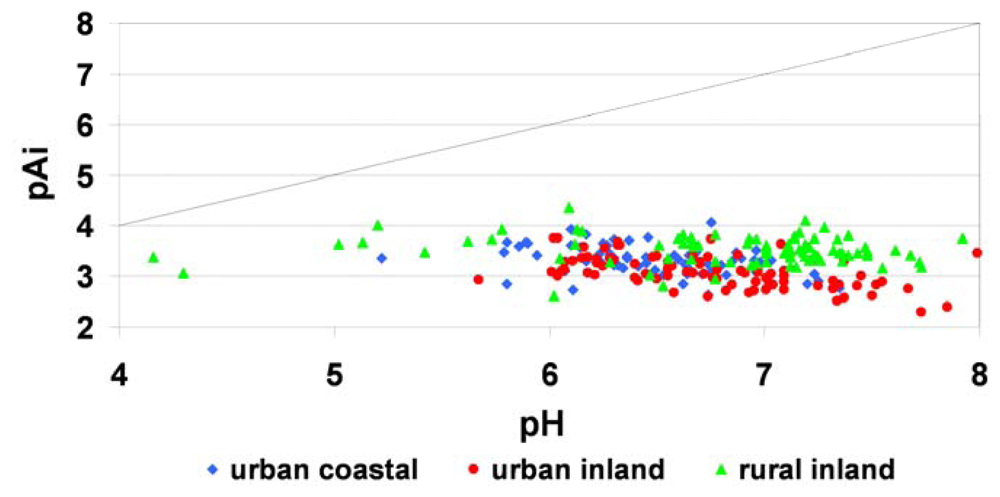 For all of the samples, pAi values appeared in a highly limited range when compared with pH results. This suggests that pH was controlled by a basic species, which was further evidenced by plotting H+/Ai against pH in Figure 9, where pH values decreased with increasing fractional acidity, H+/Ai [26].