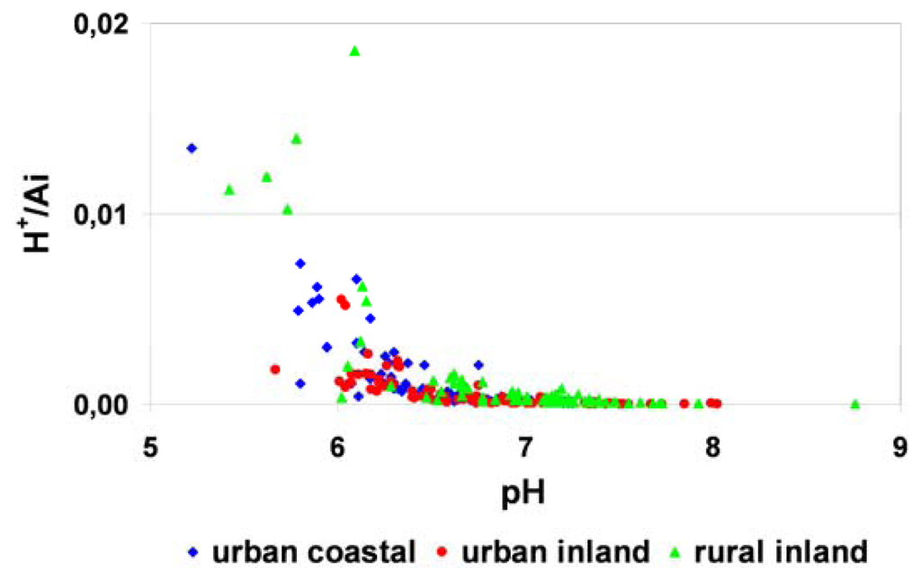 Fractional acidity, H+/Ai against pH for dew samples from different types of landuse in Poland.