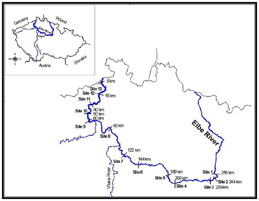 The River Elbe is one of the most extensive aquatic ecosystems in Central Europe. It is 1,091 km long (370.2 km of which are in the Czech Republic). Its extensive basin, an area of 148 268 km2, lies within the boundaries of two countries, the Czech Republic and Germany. Pollution of the Elbe River originated mainly from inflow of water from catchment areas contaminated by municipal wastes and industrial discharges (chemical industries, paper mills, waste water works, shipbuilding yards) [] and from tributaries of Elbe []. Thus sites located downstream of large cities along the river are the most representative models for long-term monitoring surveys and for the determination of levels of contamination. Significant sources of contamination, besides industrial and municipal waste, include agriculture, uncontrolled erosion, soil leaching and surface runoff.