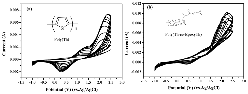 Cyclic voltammograms of polymers during electropolymerization in acetonitrile sol'n. poly(Th) (a), and poly(Th-co-EpoxyTh) (b).