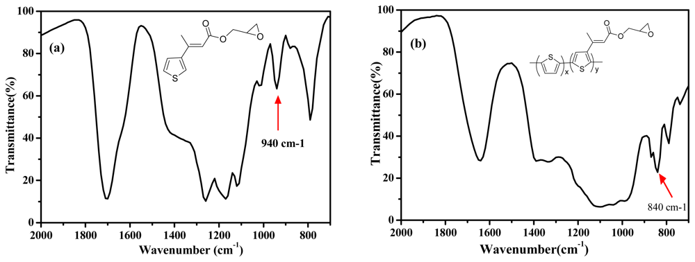 FTIR spectra of EpoxyTh monomer (a), and poly(Th-co-EpoxyTh) film (b).