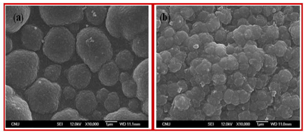 SEM images(* 10,000) of poly(Th) (a), and poly(Th-co-EpoxyTh) (b).