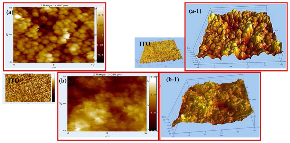 Figure 3 presents the SEM images of the polymer electrodes such as poly(Th) (a), and poly(Th-co-epoxyTh) (b) on ITO electrode prepared by electrochemical copolymerization. The surface morphology of poly(Th) electrode appeared with typically roughness and fractal-like growth patterns. On the other hand, the surface morphology of poly(Th-co-EpoxyTh) electrode was shown as like small fractal growth patterns. AFM images [Figure 4(a, b)] and 3D projection of AFM [Figure 4(a-1,b-1)] corresponding to the surface profile of poly(Th) and poly(Th-co-EpoxyTh) were presented, respectively. The surface profile of poly(Th) film was the rough with fractal-like patterns, while the surface morphology of poly(Th-co-EpoxyTh) was dramatically changed to smooth fractal behavior. Poly(Th-co-EpoxyTh) has large features with sizes larger than observed for the surface of poly(Th).