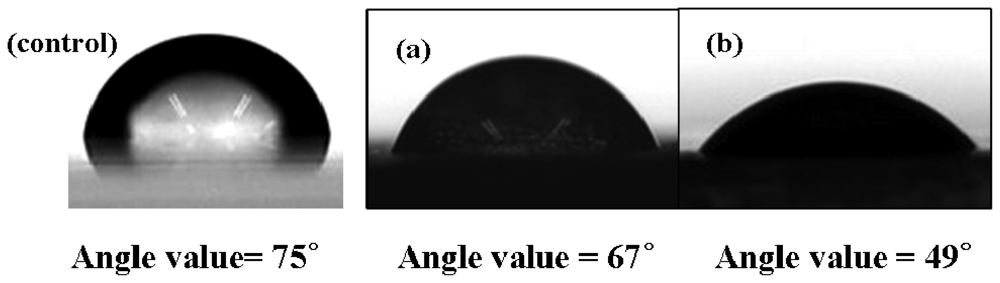 Water contact angle for non-treatment ITO glass (control), poly(Th) (a), and poly(Th-co-EpoxyTh) (b).