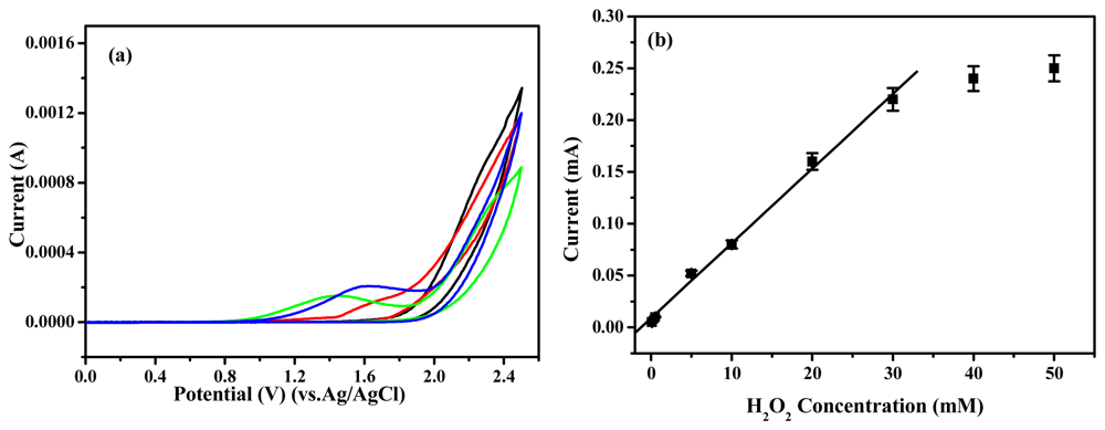 Cyclic voltammogram of H2O2 sensing from enzyme modified poly(Th-co-EpoxyTh) electrode (a) at 5 mM (black), 10 mM (red), 20 mM (blue), and 30 mM (green) of H2O2, and the calibration plot of the above electrode (b) according H2O2 concentration.