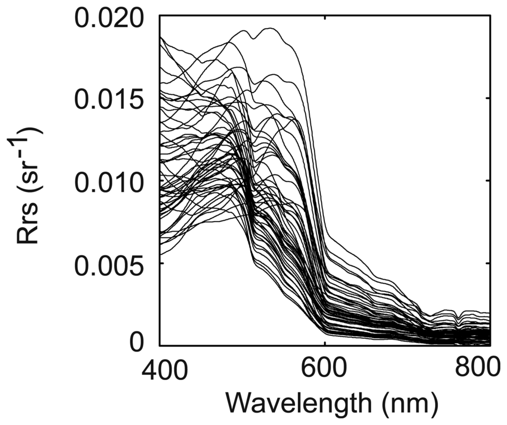 Although the Rrs spectra derived from Ocean Optics USB2000 are continuous (2048 channels between 350 and 1000 nm), we only considered, in this paper, the values obtained at a few selected wavelengths which correspond to the wavebands of the major sensors used in coastal oceanography such as MODIS, MERIS, TM, ETM+, SeaWiFS, OCTS. These wavebands (or, to be more precise, the centers of the detected wavebands) are located at 412, 443, 490, 510, 520, 530, 550, 560, 565, 620, 665, 670, 681, 705, 750 and 870 nm.