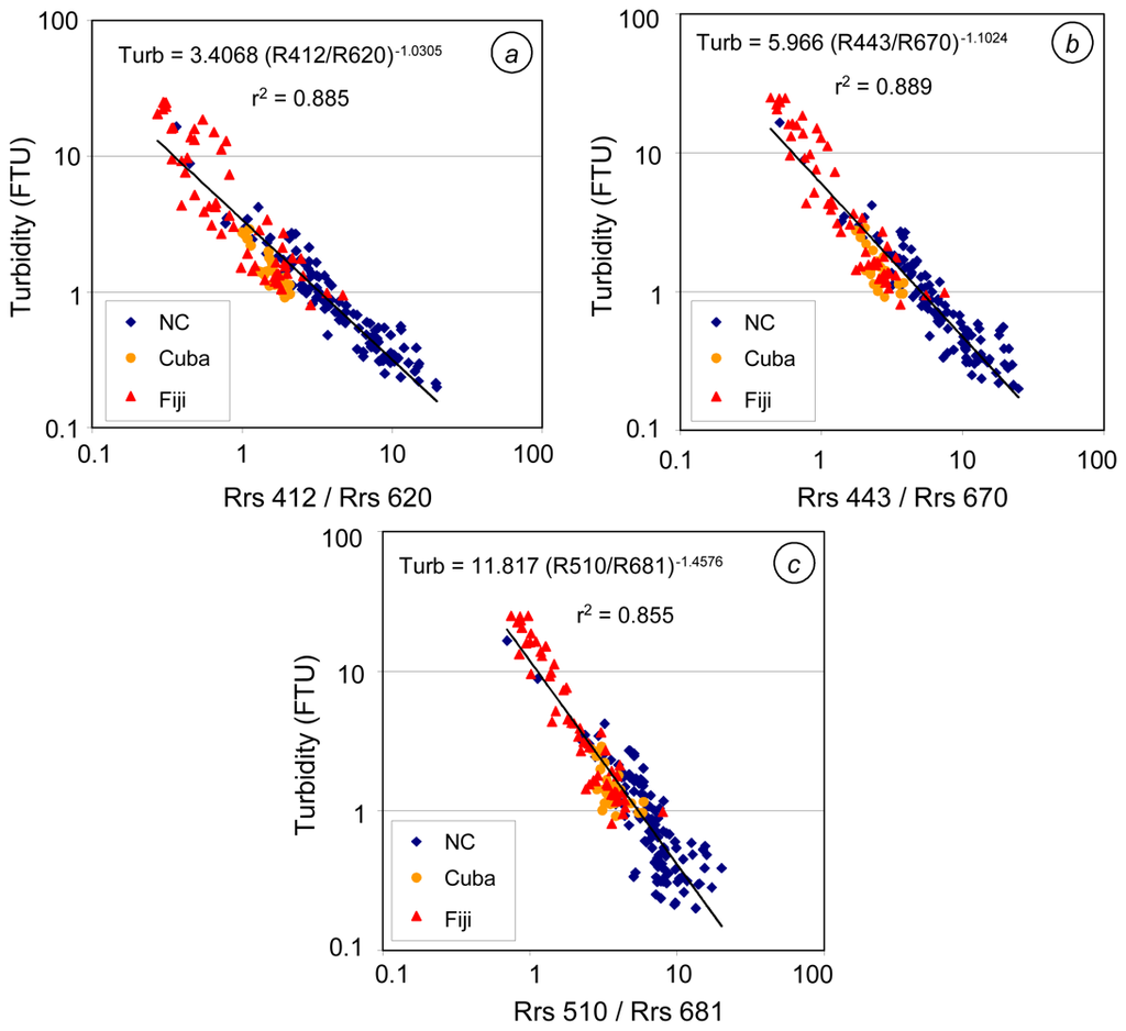 Best-fit band ratio algorithms for turbidity in tropical waters (N=193: 113 stations in New Caledonia, 24 in Cuba and 56 in Fiji) (a) using R412/R460. (b) using R443/R670. (c) using R510/R681.