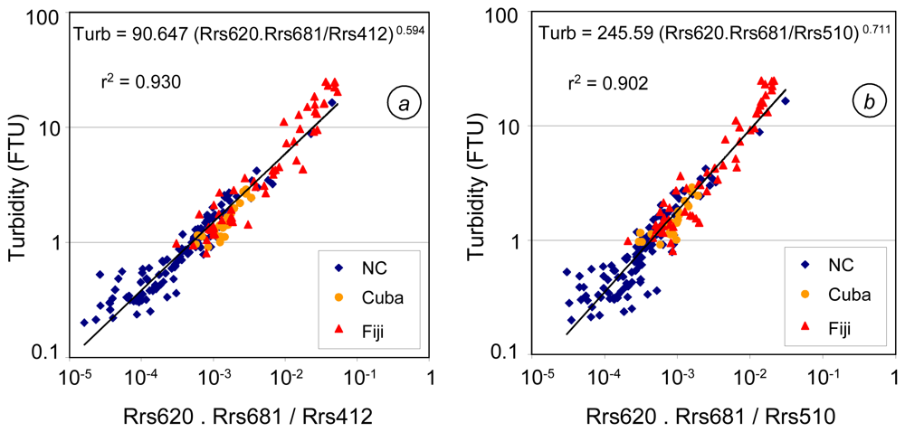 Best-fit three band algorithms for turbidity in tropical waters (N=193: 113 stations in New Caledonia, 24 in Cuba and 56 in Fiji) (a) using Rrs620.Rrs681/Rrs412.