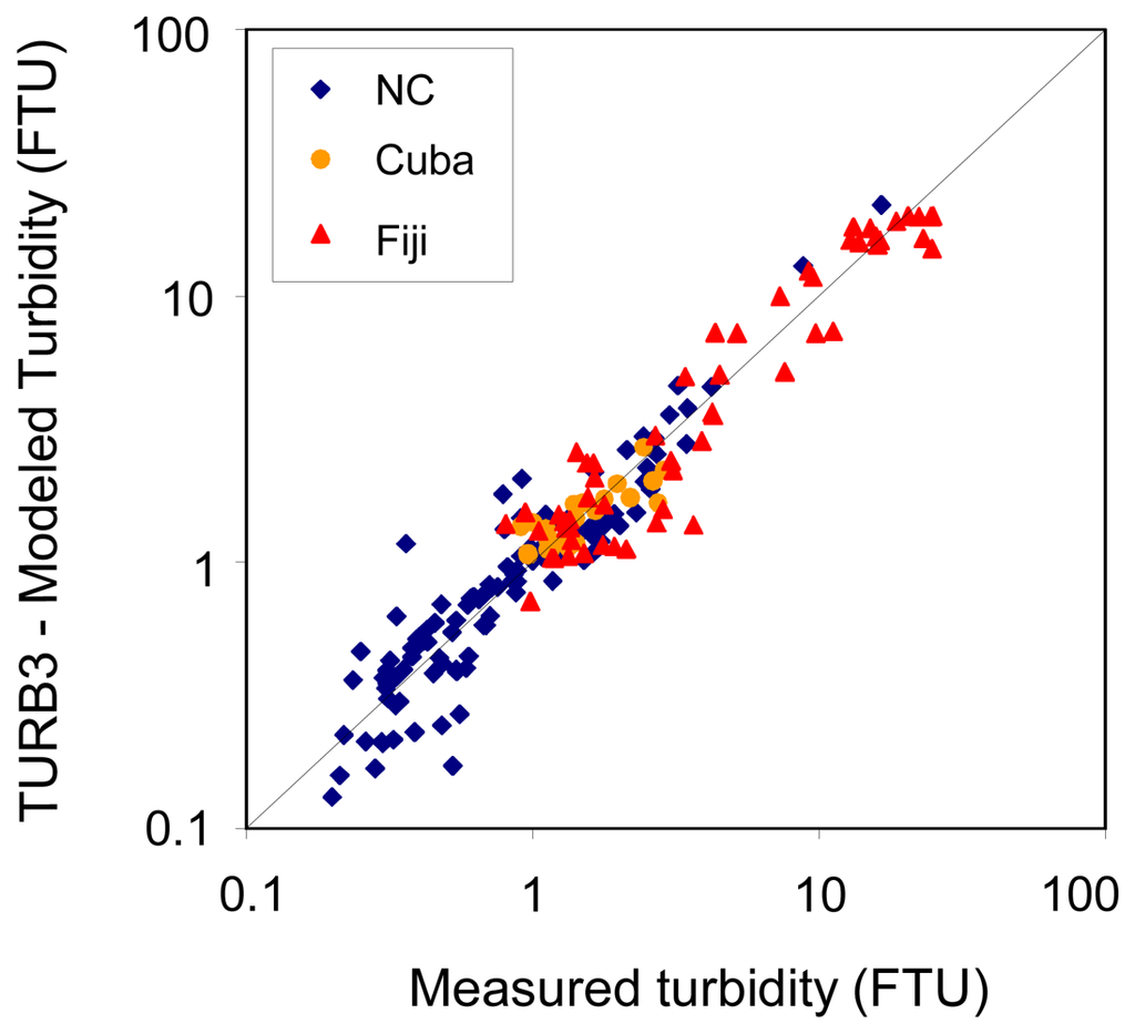 Global algorithms were tentatively derived from the entire data set and were shown to estimate turbidity with a rms error of 30-35%. When we used the derived algorithms to model turbidity, rms errors between modelled and measured turbidity varied from a site to another : ∼38% in New Caledonia, 20% in Cuba and 33% in Fiji using TURB3 algorithm, and ∼28% in New Caledonia, 21% in Cuba and 34% in Fiji using algorithm 6.