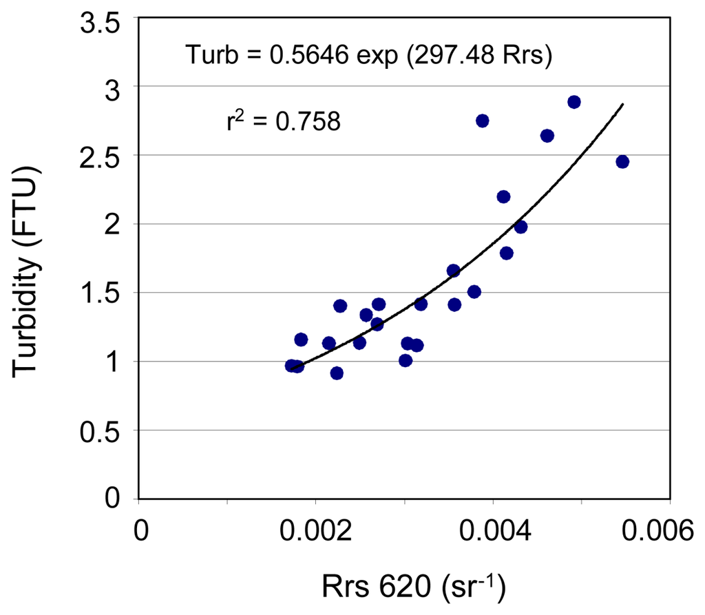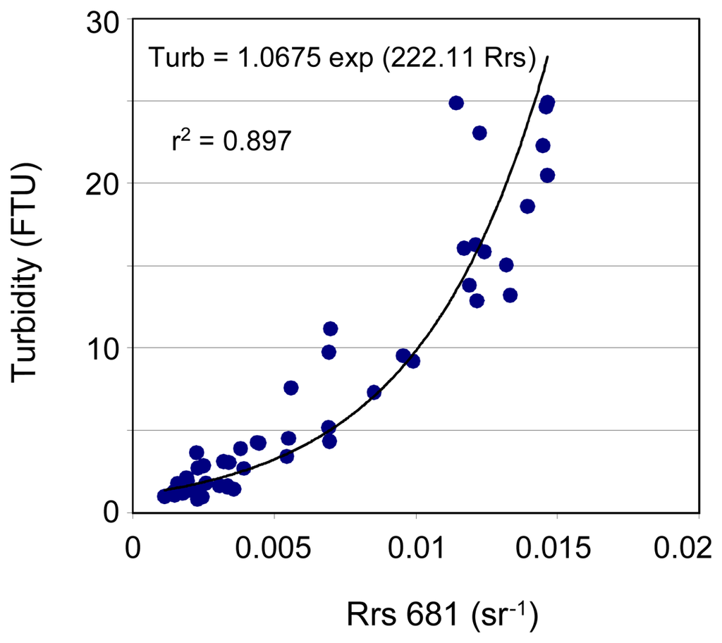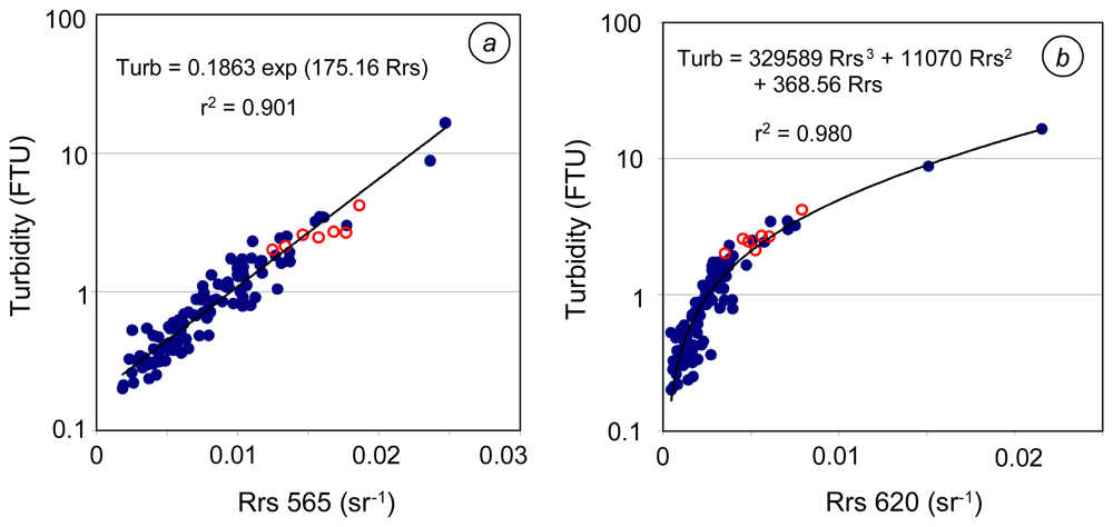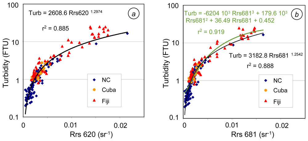 Slightly lower statistical performances are obtained between Rrs681 and turbidity using a power model (see Table 2). And still lower statistical performances are obtained with Rrs705. The two-band algorithms show poor statistical performances in Cuba, where chl-a concentrations are likely the highest of the three sites, on average.