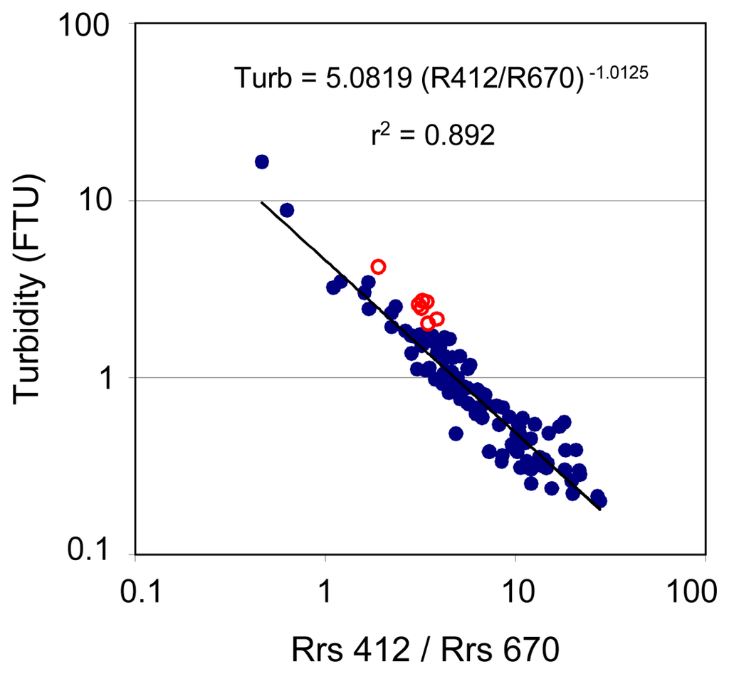 Apart from one-band wavelength algorithms, we examined the correlation between reflectance ratios at the central wavelengths of generic bands and turbidity. The best correlation was obtained using the ratio Rrs412/Rrs670 [also hereafter noted R412/R670 since the reflectance ratio is the same as the ratio of remote sensing reflectances] (Fig. 3); close performances were obtained using ratios R412/R620 and R443/R670.